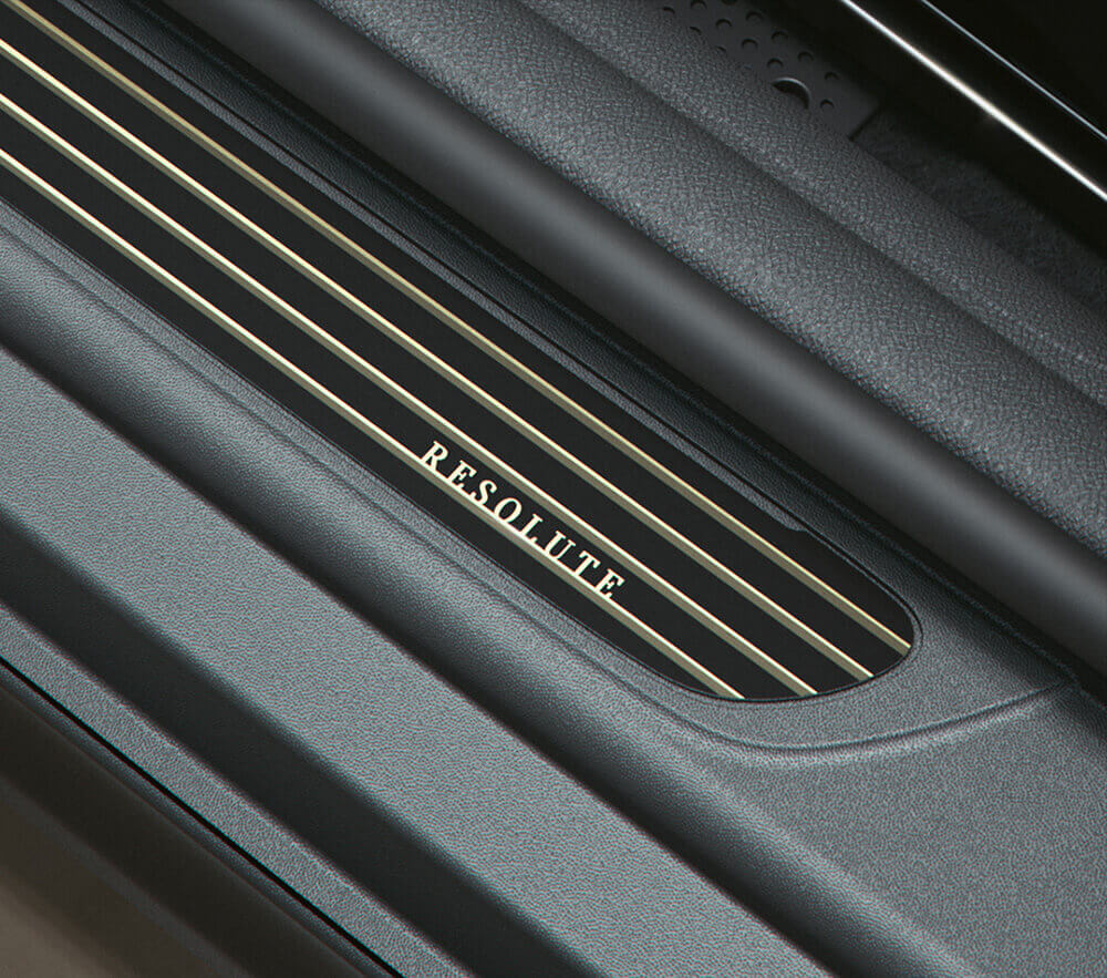 霧銅線條與Resolute Edition字樣組成專屬迎賓門檻,以獨有格調迎接駕駛與乘客入座。